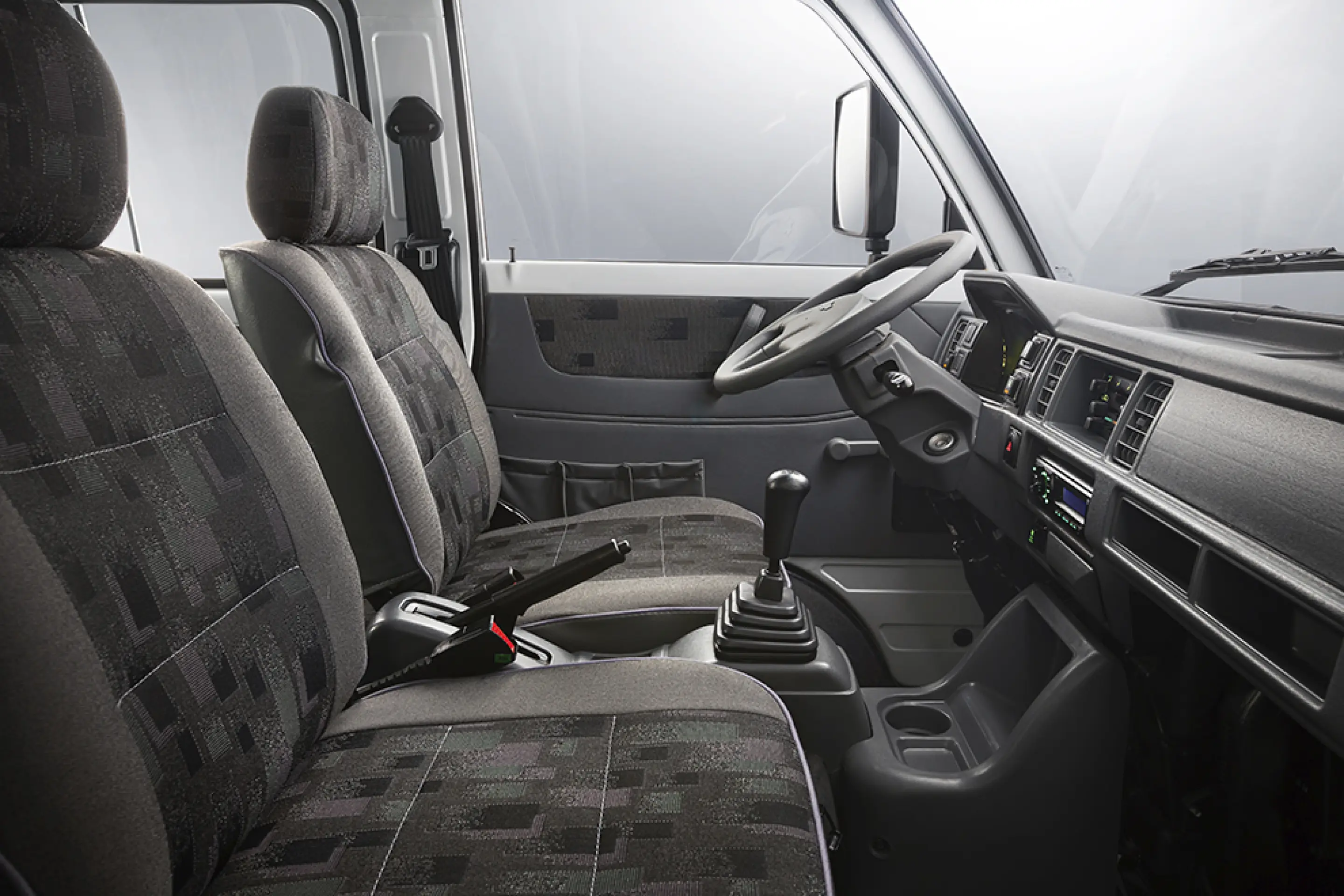 Руль, лишенный гидроусилителя, расположен горизонтально, как в автобусе, что требует специфической посадки. Водитель сидит высоко, прямо над передней осью, что обеспечивает великолепный обзор вперед, но колени рослых драйверов неизбежно будут упираться в переднюю панель или рычаг коробки передач.